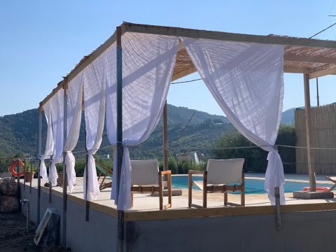 Περιβάλλεται από ελιές που σας κρατούν σκιερούς τις ζεστές μέρες του καλοκαιριού. Λίγα μέτρα από τις σκηνές, οι επισκέπτες μας μπορούν να κοινωνικοποιηθούν στον κοινόχρηστο υπαίθριο χώρο, όπου θα βρουν εγκαταστάσεις μπάνιου, ανεμιστήρες και Wi-Fi για να παραμείνουν συνδεδεμένοι (η ένταση του σήματος μπορεί να διαφέρει από τόπο σε τόπο). Ένα δείπνο στο ύπαιθρο μπορεί να μαγειρευτεί στην κοινή εξωτερική κουζίνα και να το απολαύσετε στην όμορφη εξωτερική τραπεζαρία. Να χαλαρώσετε γύρω από την πισίνα ενώ πίνετε ούζο είναι μια άλλη από τις απολαύσεις που μπορείτε να απολαύσετε, ή ένα απογευματινό ύπνο στην αιώρα, σκιασμένο από ελαιόδεντρα.