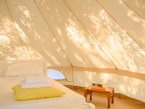 Οι υπέροχες σκηνές μας βρίσκονται ανάμεσα σε ελιές, λεμονιές και πορτοκαλιές και διαθέτουν διπλά κρεβάτια ή δύο μονά κρεβάτια με μαλακά κλινοσκεπάσματα και λευκά είδη. Τα ιδιωτικά μπάνια (σε απόσταση λίγων μέτρων) έχουν ντους και τουαλέτα. Οι σκηνές είναι εξοπλισμένες με ηλεκτρικό ρεύμα, διαθέτουν ψυγείο και ανεμιστήρα για τις ζεστές μέρες, καθώς και κρεμάστρα ρούχων. Όλες οι σκηνές είναι μοναδικές, βαπτίζονται με το δικό τους όνομα και φυσικά είναι διαφορετικά διακοσμημένες. Η διακόσμηση αλλάζει από έτος σε έτος. Στο μπροστινό μέρος κάθε σκηνής, υπάρχει ένας ιδιωτικός χώρος με δύο καρέκλες, ιδανικός για ένα χαλαρωτικό απόγευμα ή βράδυ, απολαμβάνοντας μια κρύα μπύρα και ακούγοντας τους ήχους των κυμάτων που χτυπούν την ακτή. Υπάρχει επίσης ένα ανάκλιντρο ή μια αιώρα για ένα απογευματινό ύπνο.