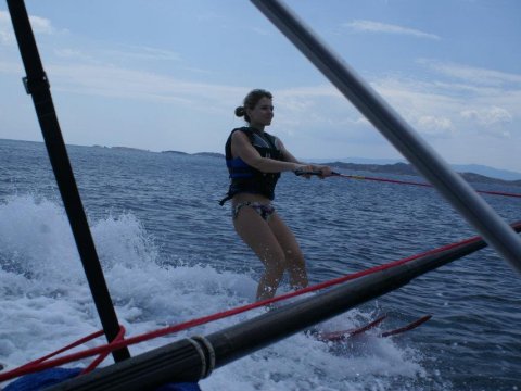 Για αθλητές Ένα σκάφος Corect Craft Ski Nautique 330 ίππων,μοντέλο 2006,εφοδιασμένο με star gazer(ηλεκτρονικό σύστημα ελέγχου ταχύτητας), ένας στίβος σλάλομ διεθνών προδιαγραφών,εξοπλισμός υψηλού επιπέδου και ένας έμπειρος προπονητής φροντίζουν να ικανοποιήσουν και αυτούς που κάνουν αθλητικό σκι, για να προπονηθούν και να ανεβάσουν το ρεκόρ τους σε ακόμα πιο υψηλά επίπεδα. Η κατάσταση του νερού είναι κατά 90% πολύ καλή από το πρωί μέχρι το μεσημέρι,με ελαφρούς στεριανούς ανέμους ή άπνοια. Μετά το μεσημέρι σε περίπτωση που πνέουν άνεμοι που επηρεάζουν το στίβο,υπάρχει η εναλλακτική λύση του απέναντι νησιού Αμμουλιανή 5 λεπτά με το σκάφος , όπου σκοπέυουμε να εγκαταστήσουμε ένα δεύτερο στίβο.