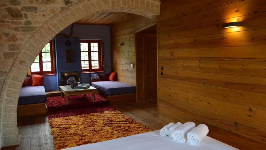 The traditional stone guesthouse is located in Kato Pedina (Soudena), is a unique village located in the center of Zagori, between Monodendri and Papigo in Epirus! Each room has a fireplace, as well as a shared lounge and bar.
