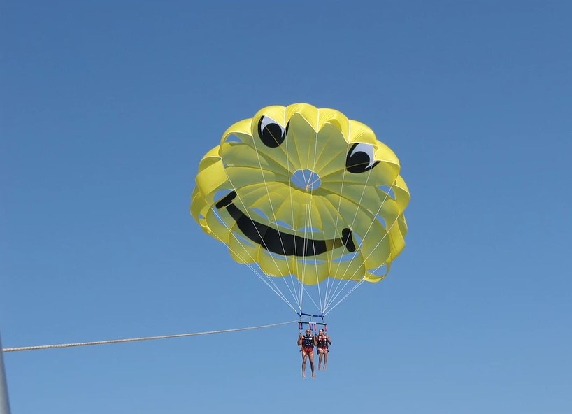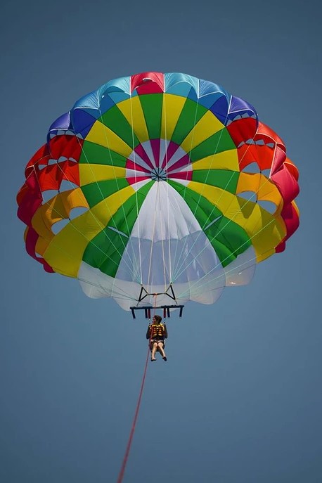 Fly safely over the deep blue. Enjoy the panoramic view of Santorini from 350 feet height with a parasailing. One or two people at the same time are taking off from a specially adapted boat and are landing dry. Perfect equipment and the highly trained crew guarantee you a superb and safe flight. It is a unique experience!